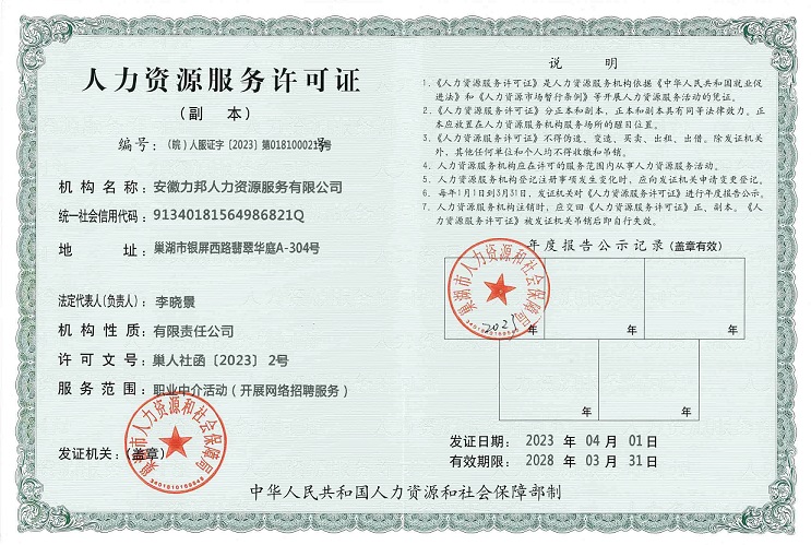 安徽力邦人力资源服务有限公司是2010年经上级人力资源和社会保障主管部门严格审批设立的综合性人力资源服务公司,具有安徽省人力资源服务AAAA级资质,被认定为“合肥市劳动保障诚信示范单位”和“劳动保障诚信A级企业”,是合肥市人力资源协会单位。公司以“依法专…【更多】